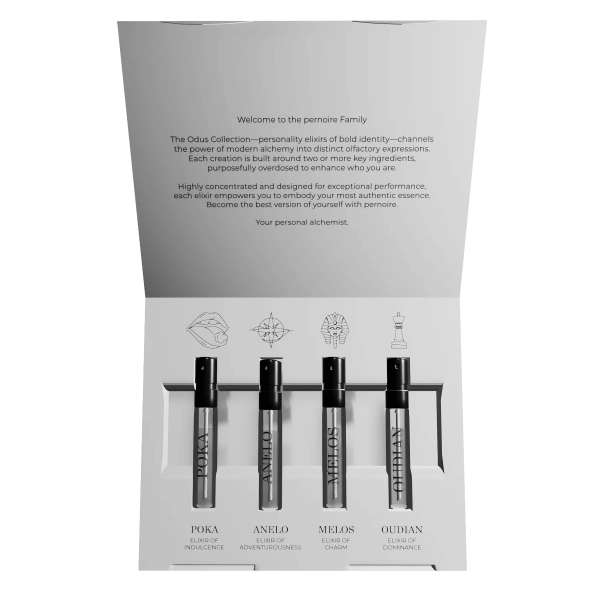 Discover the boldest side of perfumery with the Odus Discovery Set. Four uncompromising creations, crafted in Switzerland at 30% extrait concentration, each built on a daring overdose of rare essences. Long-lasting, expressive, unforgettable.